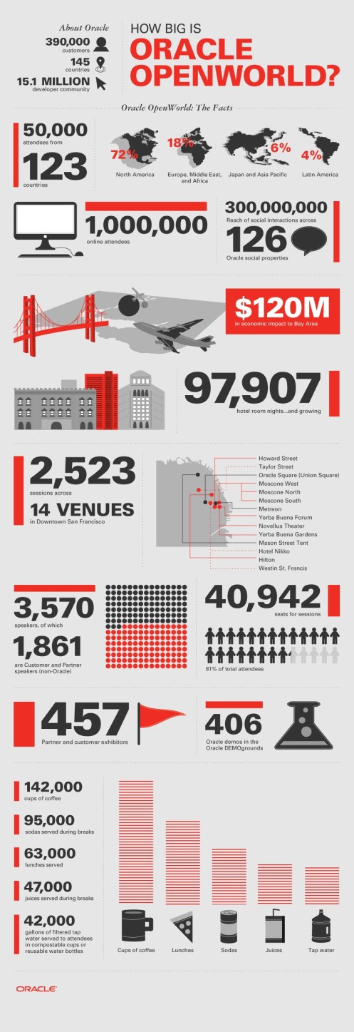 Lots of great info at this year’s Open World. Stay tuned to this Blog for updates… In the mean time.. this is quite an impressive stat graphic that shows you how huge OOW is.