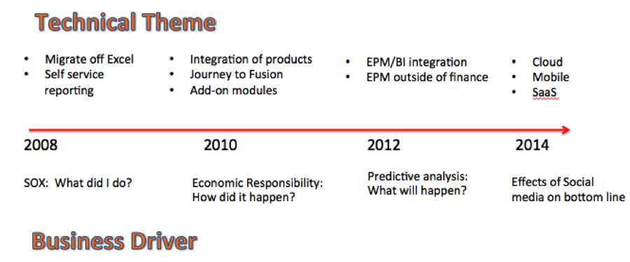 - TODAY: Integration of EPM and BI integration outside the context of Finance. True Financial and Operational Performance management as a necessary input for overall Business Intelligence, CLoud and SASS, Mobile