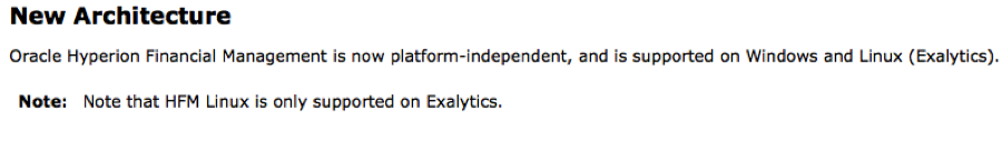 Oracle also said that their Exalogic OVM, which is an OEL based image, that they have available for download on OTN, will also allow HFM to run on it. Of course, it will not be suitable for a Production environment, but, at least it’s something to play around with.